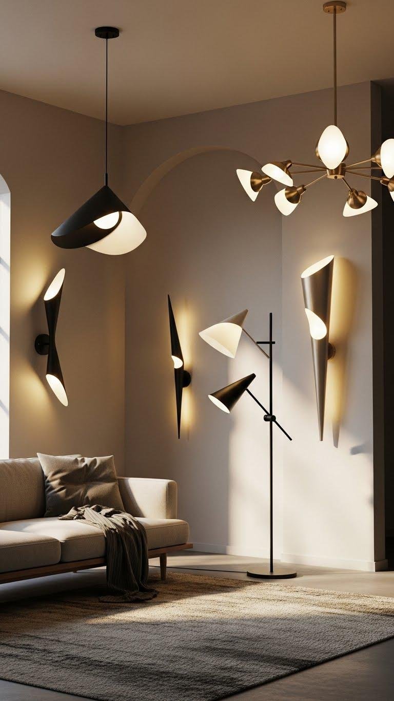 Pick a sculptural lighting fixture that doubles as art—an eye-catching pendant, an asymmetrical floor lamp, or a clustered chandelier can anchor your room while casting layered light.