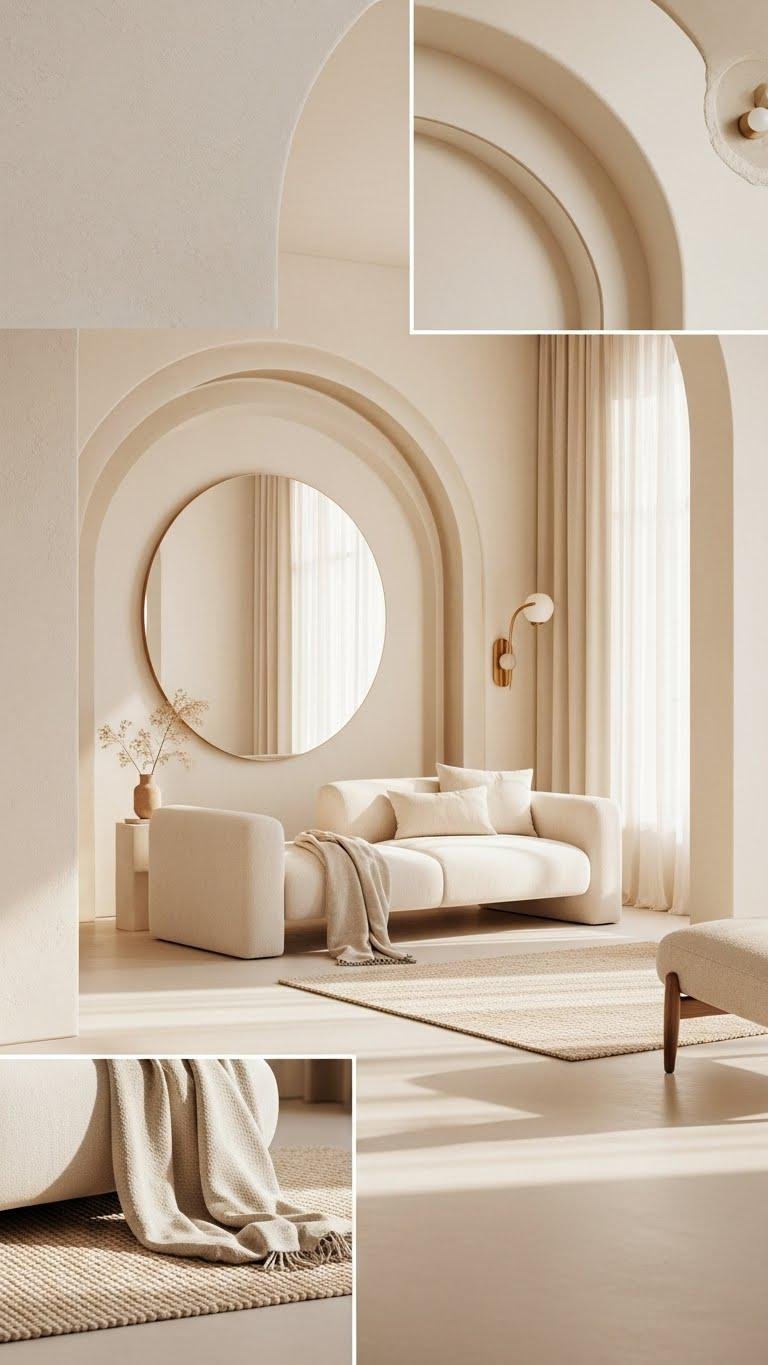 Soft arches and rounded mirrors already mellow a space; warm off-whites and creams finish the job by bathing those curves in cozy, flattering light. You’ll embrace soft neutrals that expand sightlines, pair creamy textiles with minimal silhouettes, and layer matte paint, light rugs, and sheer drapes for depth. The result feels open, calm, and liberating—modern warmth without clutter or constraint.