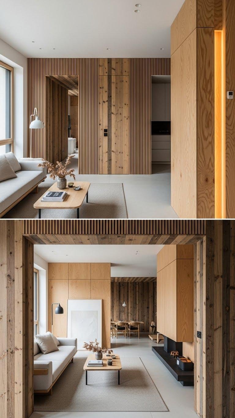 Natural wood paneling instantly grounds a modern apartment, adding warmth, texture, and a tactile backdrop that feels curated rather than cluttered.