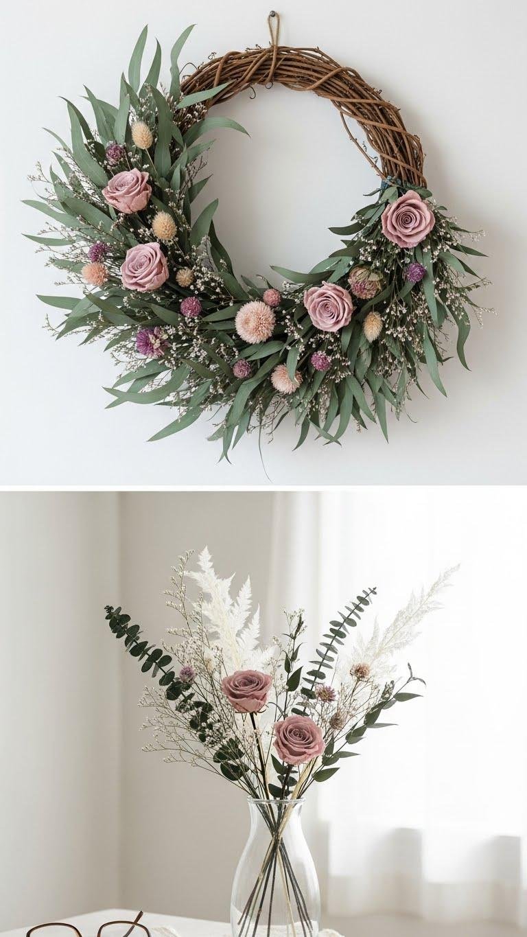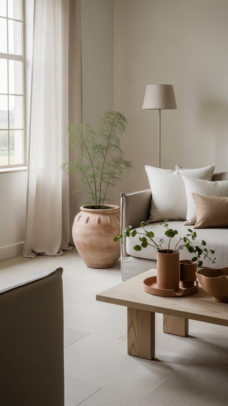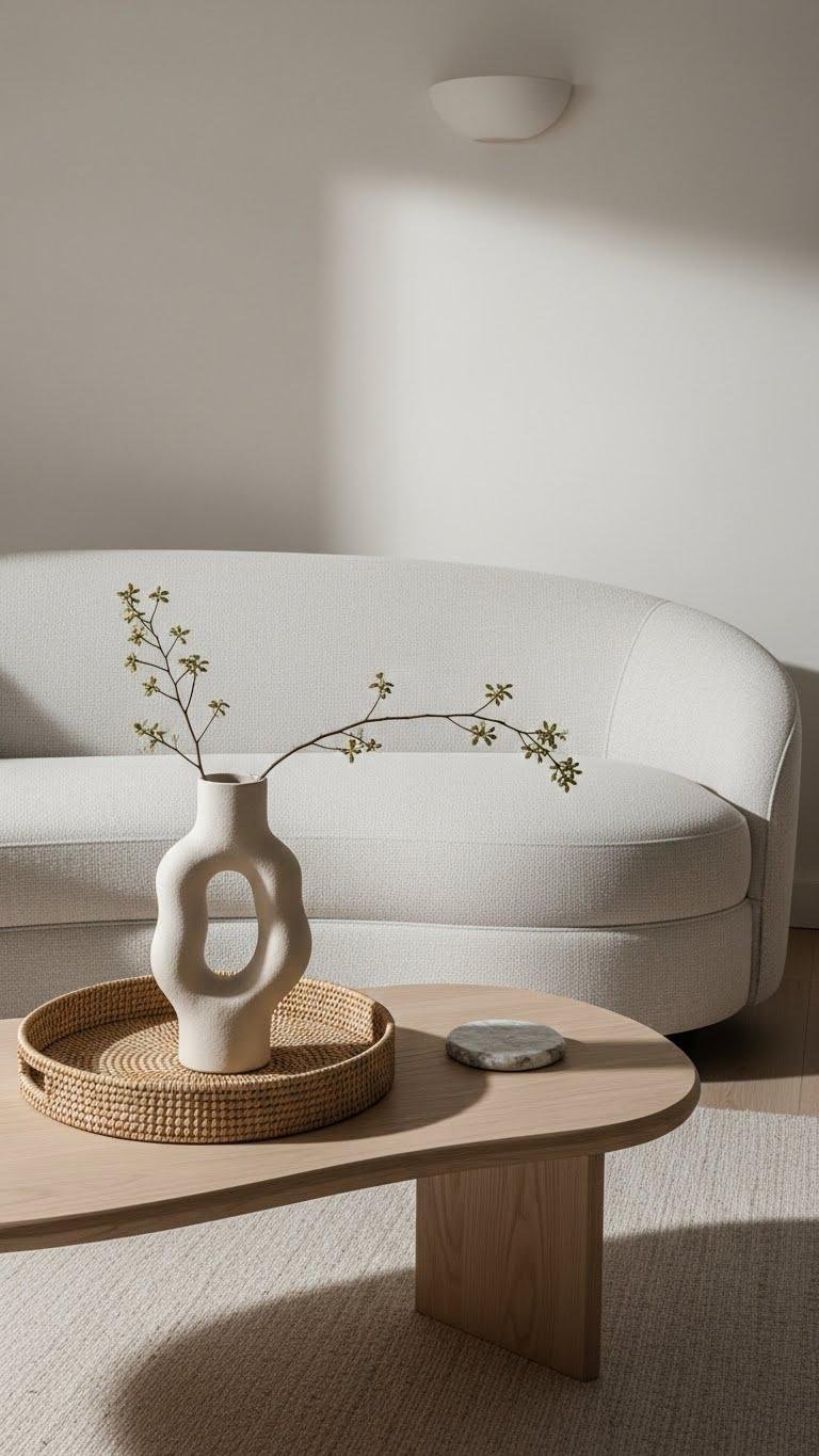 After you’ve softened the room with curved seating, create a quiet focal point: a minimalist vignette layered with natural textures. Pick a low table, place a woven tray, a sculptural vase with a single branch, and a stone coaster for your cup. You’ll keep surfaces calm, let tactile elements breathe, and invite a liberated, unfussy atmosphere that feels airy and intentional.