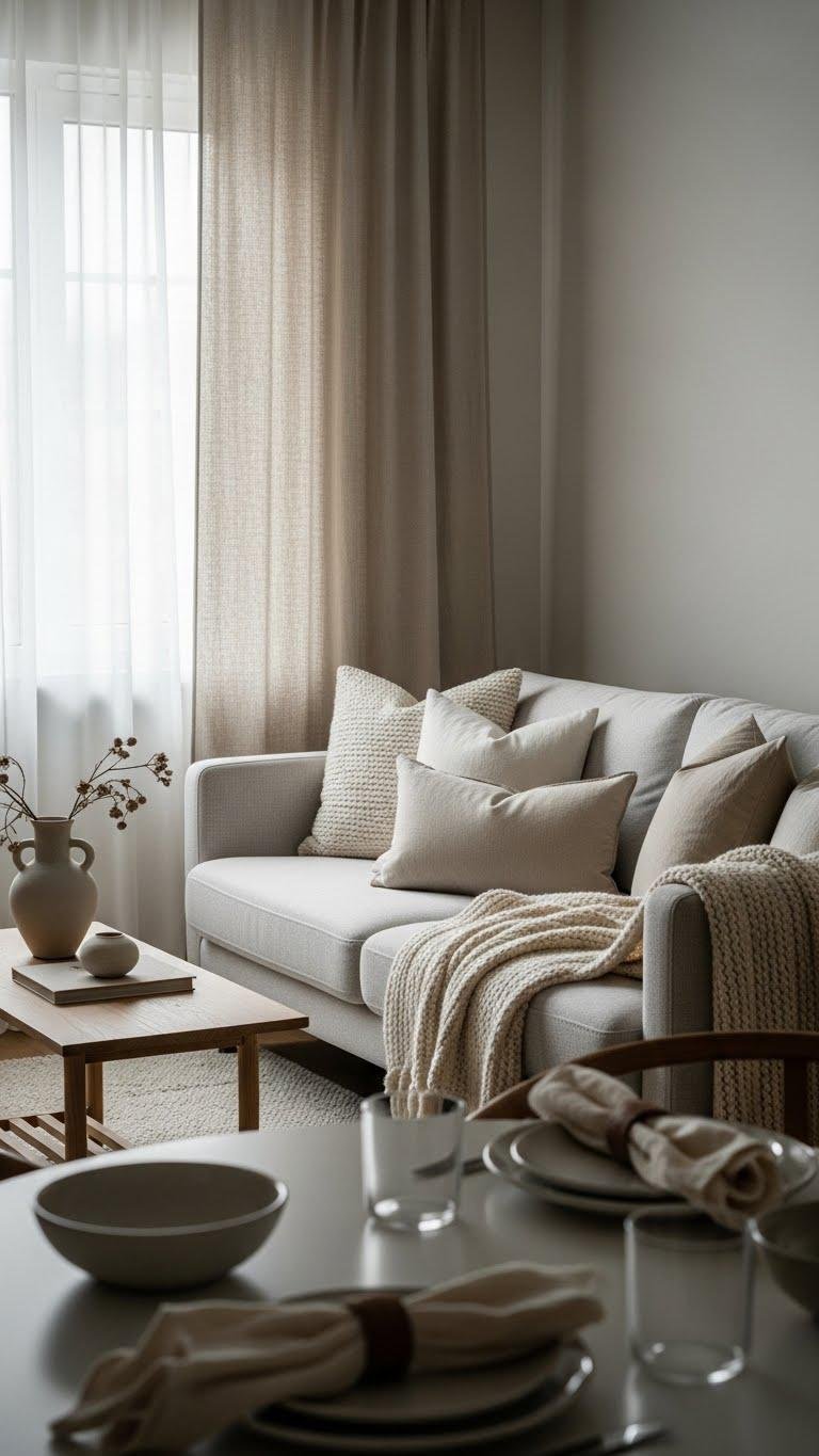 You’ll pair bouclé throws on a streamlined sofa, add linen napkins for casual dining, and choose a muted palette. Let layers read relaxed, modern, and free — no clutter, just soulful simplicity.