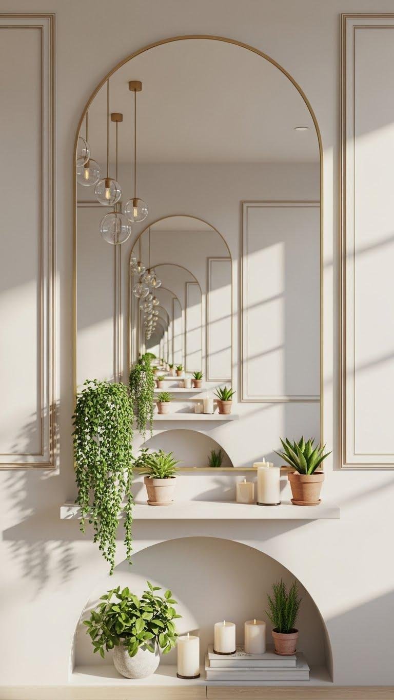 Your room’s light multiplies when you add an arched mirror—its soft curve bounces sunlight and creates the illusion of extra windows without cluttering the wall. Place an arched ledge beneath it to style plants or candles. You’ll balance scale by keeping a mirror clustered group minimal, letting reflections expand space. Pick thin frames and airy placements for a fresh, free feeling.