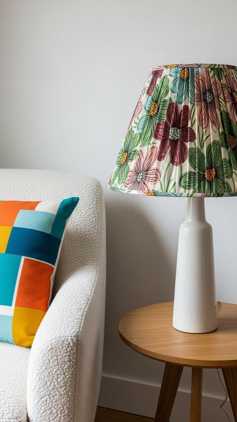 Patterned accents add personality without overwhelming a small room, so pick one playful motif and repeat it in tiny doses — a throw pillow, a lampshade, and a single framed print — to create rhythm without clutter. You’ll mix whimsical wallpaper sparingly as a focal spot, add patterned throw pillows for instant cheer, and keep surrounding surfaces neutral so the pattern feels liberating, not busy.