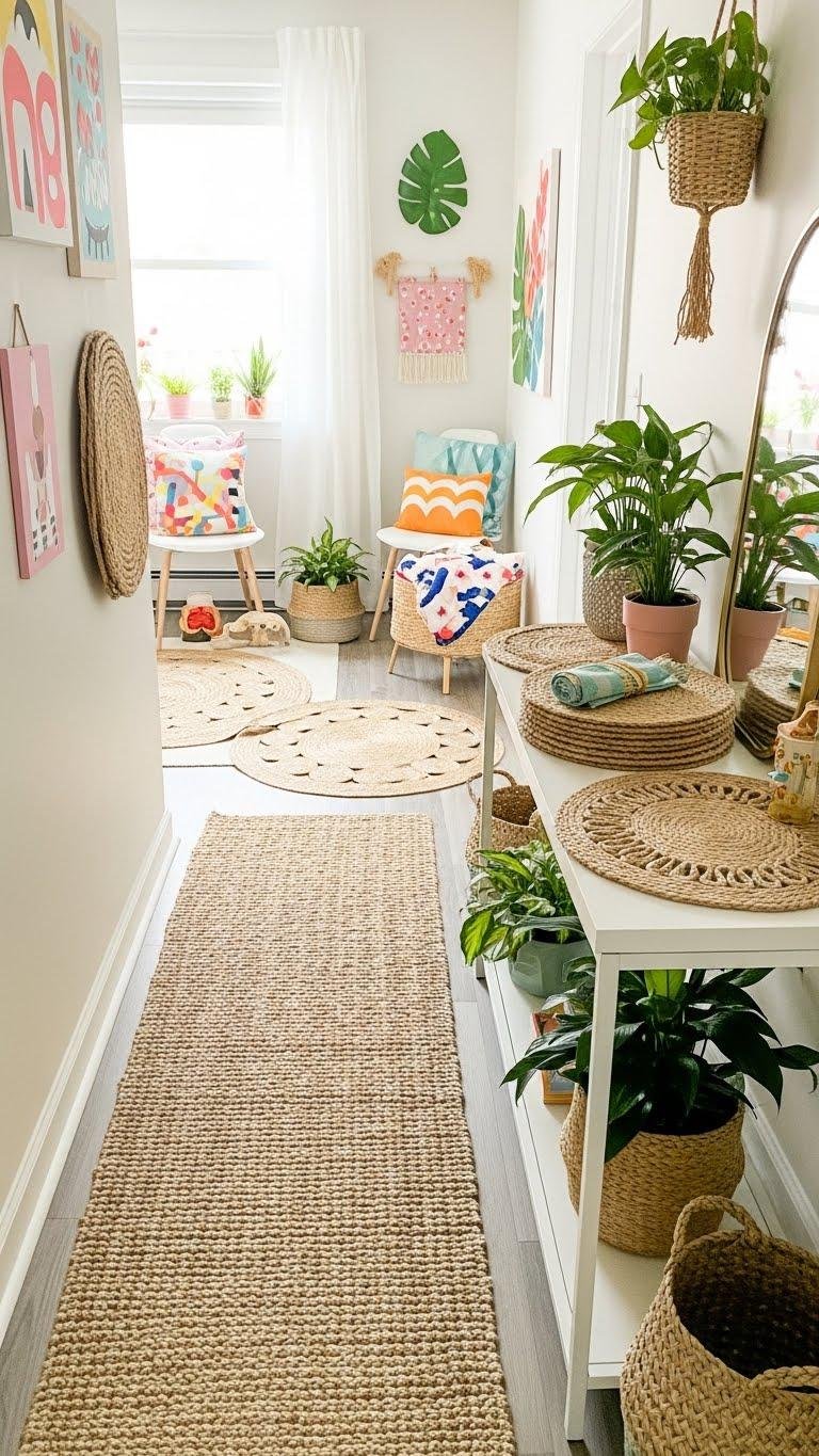 Choose seagrass runners to elongate hallways and keep sightlines open. Layer in jute placemats on console tables or under plants for cohesion. These breathable, low-profile pieces feel fresh, effortless, and free—perfect for a bright, modern spring vibe.