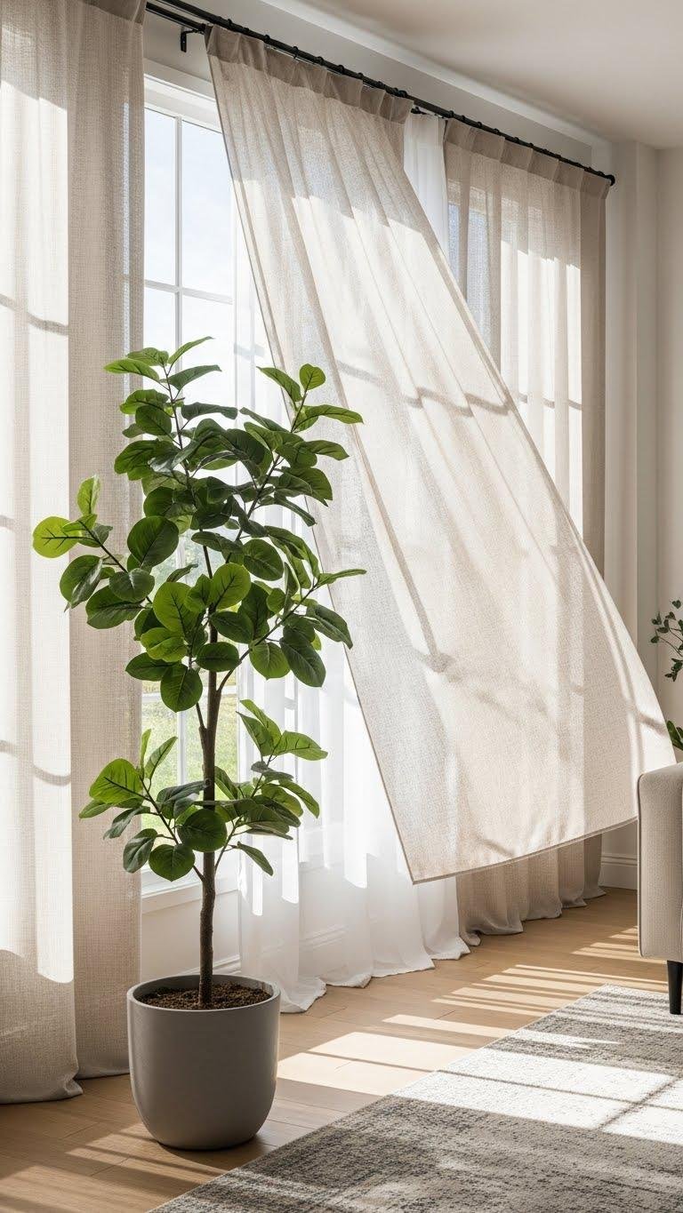Pair that sculptural plant with airy window treatments to let light and movement play off its form. Swap heavy drapes for linen sheers and a light filtering voile to brighten the room and keep views open.