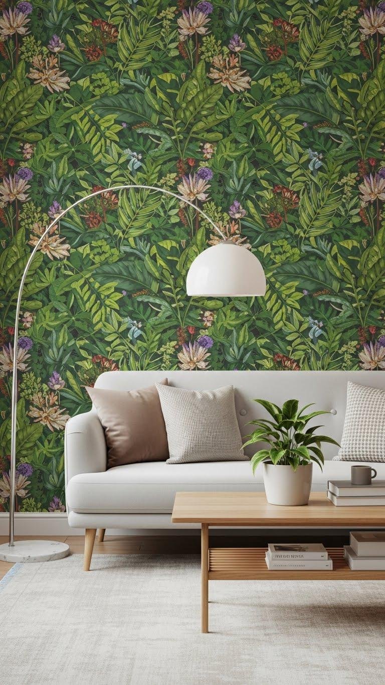 A botanical-feature wall instantly anchors a room, giving you a bold focal point without cluttering the space.