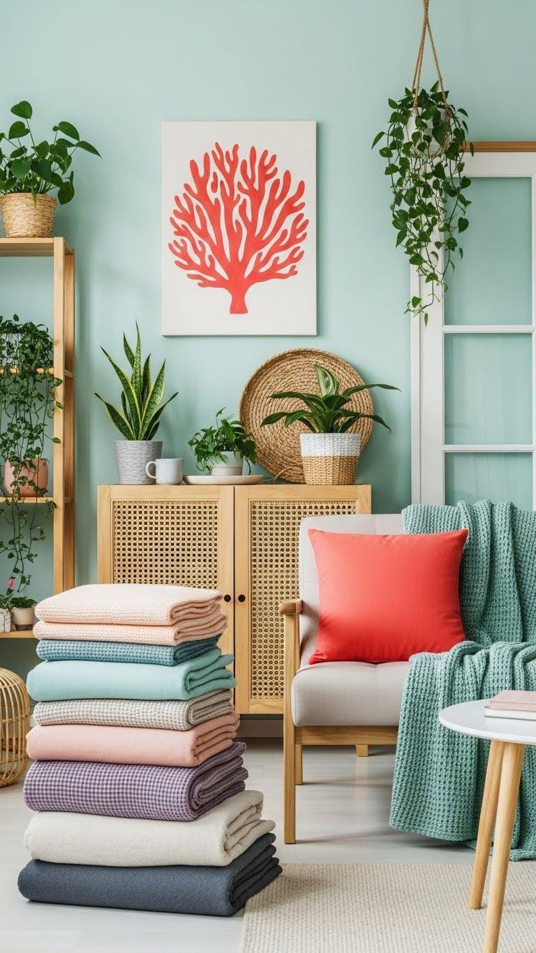 You’ll layer soft mint walls or textiles with a coral pop pillow or art piece to create clean contrast. Stick to one vivid hue, crisp neutrals, and natural textures. The result feels airy, intentional, and free — a fresh canvas that invites personal expression.