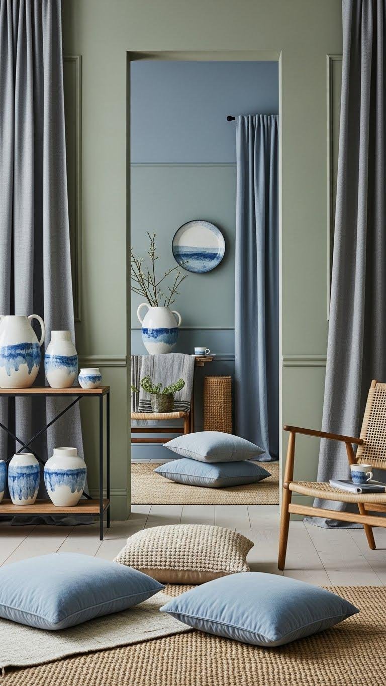 By layering sage and soft blues, you’ll build a grounded palette that feels both fresh and quietly cultivated.