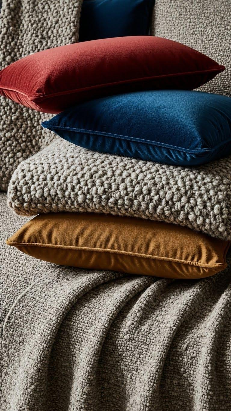 When you layer velvet and bouclé, you introduce tactile contrast that reads as both refined and inviting—velvet’s smooth, light-catching pile plays against bouclé’s nubby, matte loops to create depth without clutter.