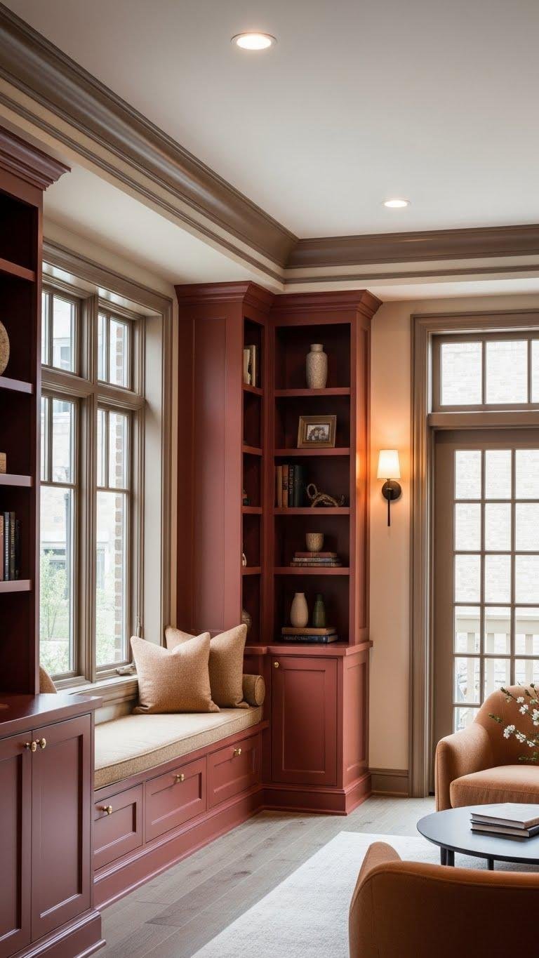 Because saturated millwork anchors a room visually, you can use warm palette hues to create intimacy without relying on textiles or art, letting the built-in elements carry mood and cohesion. Choose saturated millwork in warm hued tones, pair with tonal trim to unify sightlines, and favor matte finishes for subtle depth.