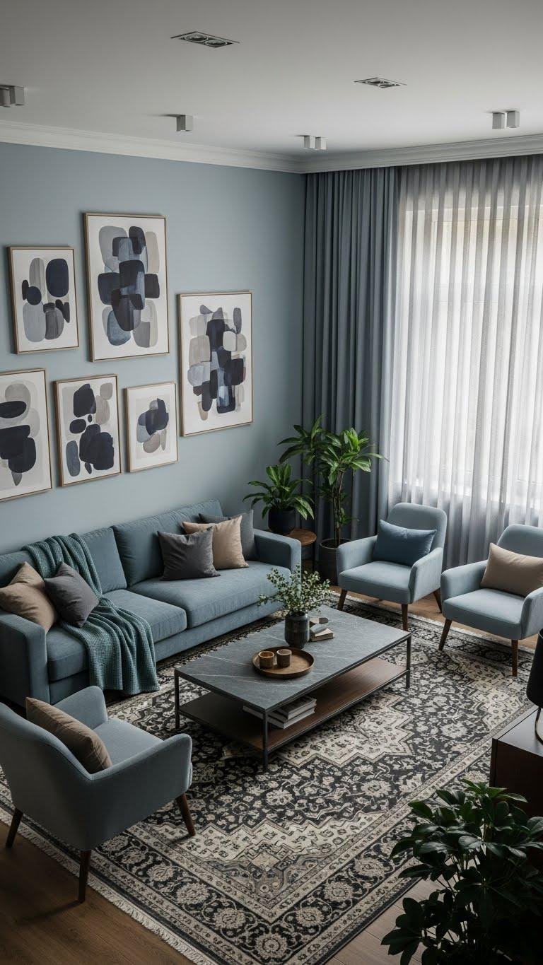 When you layer moody neutrals like charcoal, taupe, and deep greige, counterbalance their weight with soft dusty blues to keep the room feeling composed rather than heavy. You’ll mix slate gray accents with moody blue upholstery, introduce dusty sky walls or art, and add soft teal textiles.