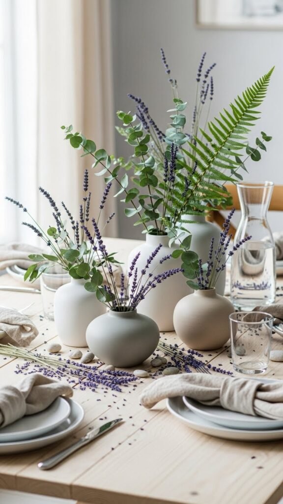 After you’ve layered natural textures to set the room’s mood, bring that calm to the table with preserved lavender and greenery centerpieces. You’ll love how lavender bouquets add quiet scent without upkeep while minimalist greenery arrangements provide sculptural movement.