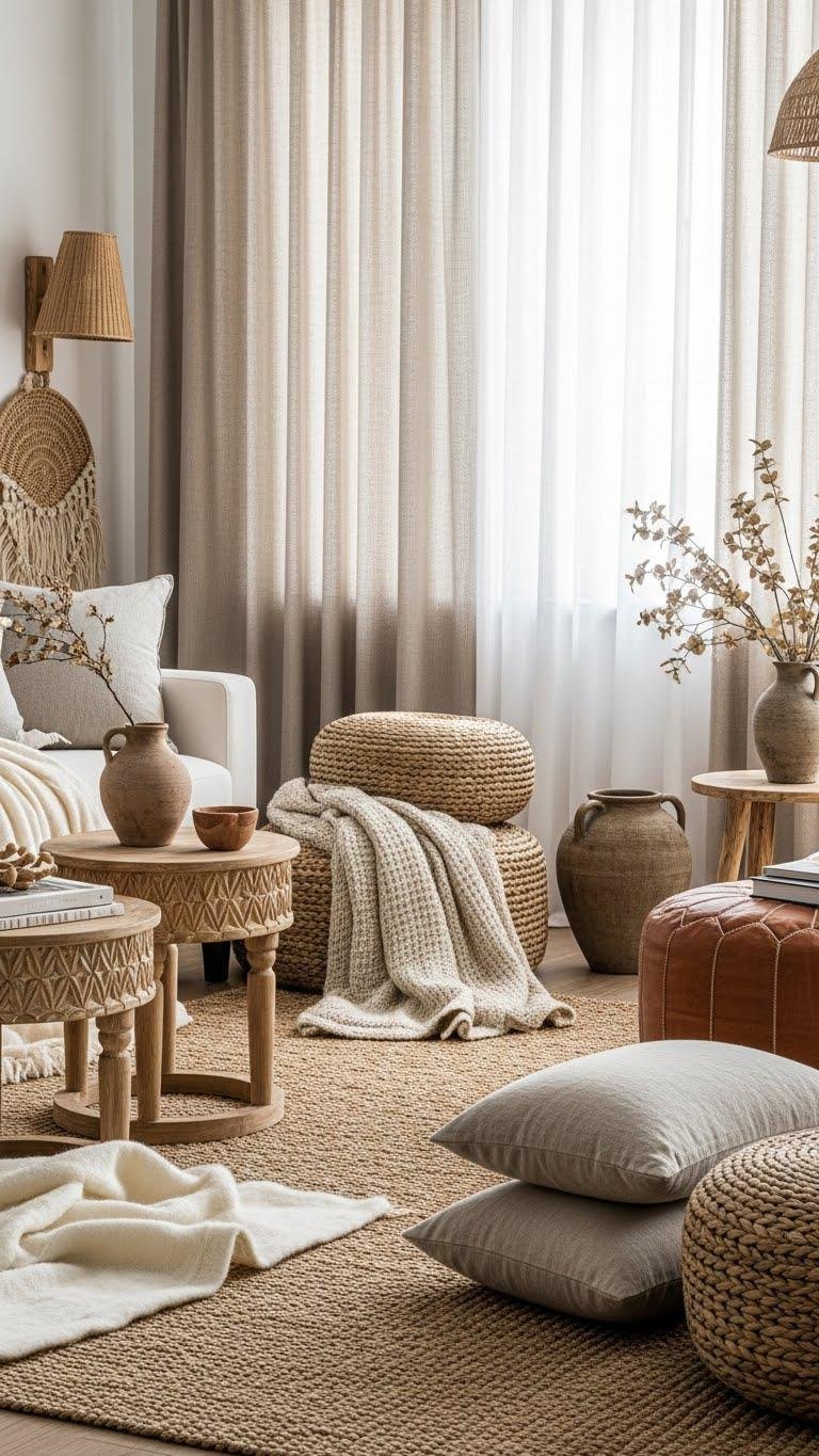 When you layer natural textures in living areas—think woven jute rugs over soft wool throws, rattan baskets beside hand-carved wood tables, and linen curtains that catch the light—you create depth without clutter. Mix woven seagrass accents with raw linen pillows, leather ottomans and clay pots. Let neutral tones, tactile contrasts and open space invite ease; you’ll craft a calm, liberated room that feels modern and lived-in.