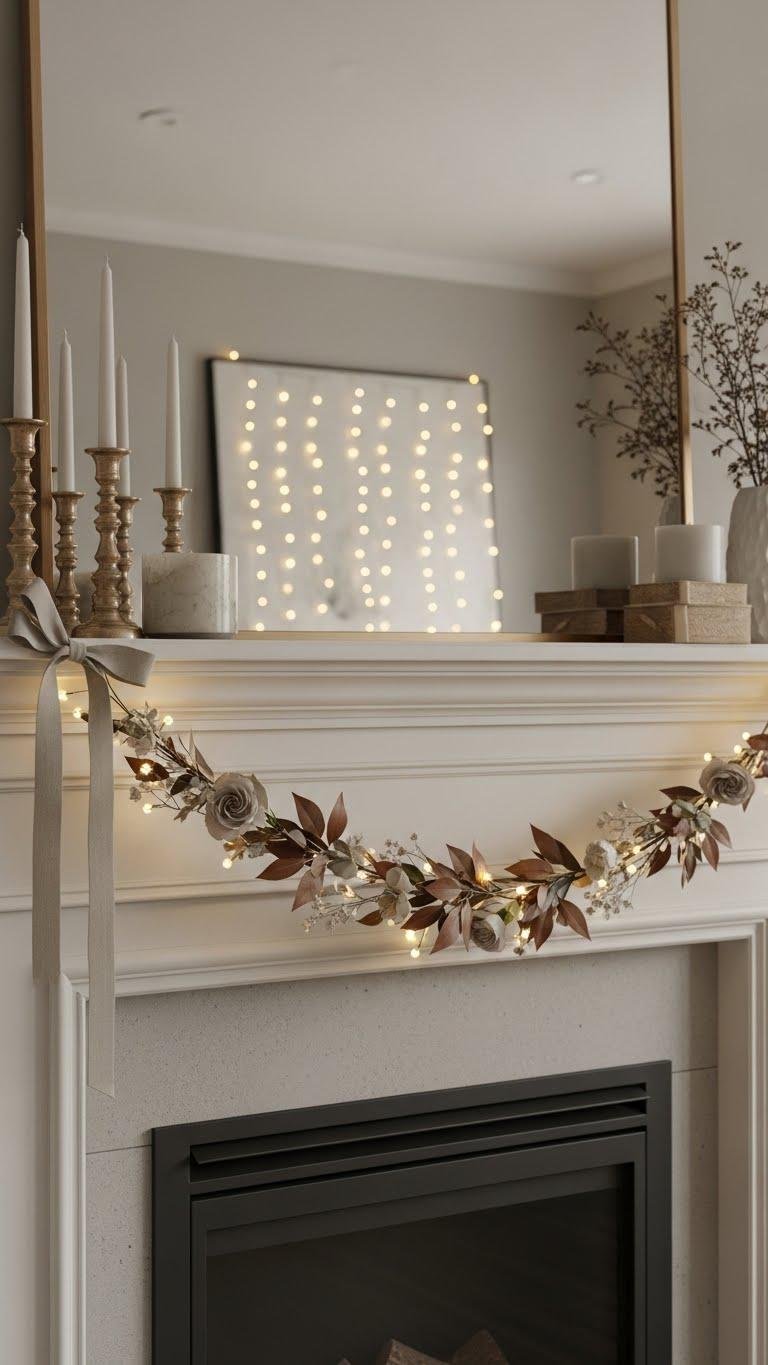 When dusk settles, stringing warm fairy lights across a neutral mantel instantly softens the room and frames your seasonal vignettes.