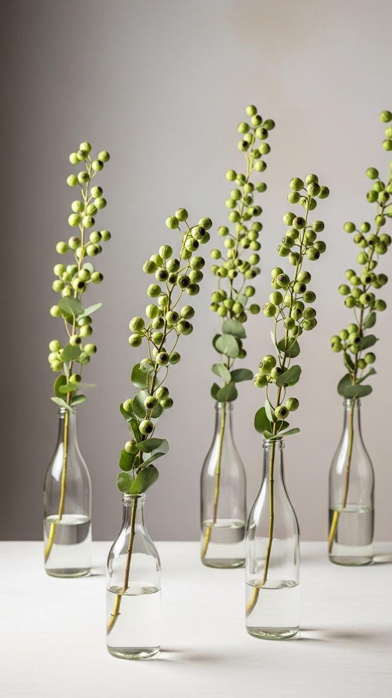 Often you’ll find that a few slender stems of seeded eucalyptus in clear glass bottles bring a fresh, sculptural note to neutral spring decor. You’ll place them solo or in small clusters, letting pale green seed pods and airy stems add rhythm without clutter.