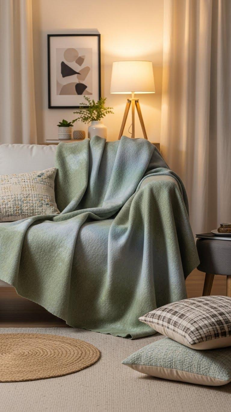 You’ll reach for a wool throw in muted greens or soft blues to anchor a neutral spring scheme — it adds immediate warmth and a subtle, fashion-forward color note without overpowering the room.