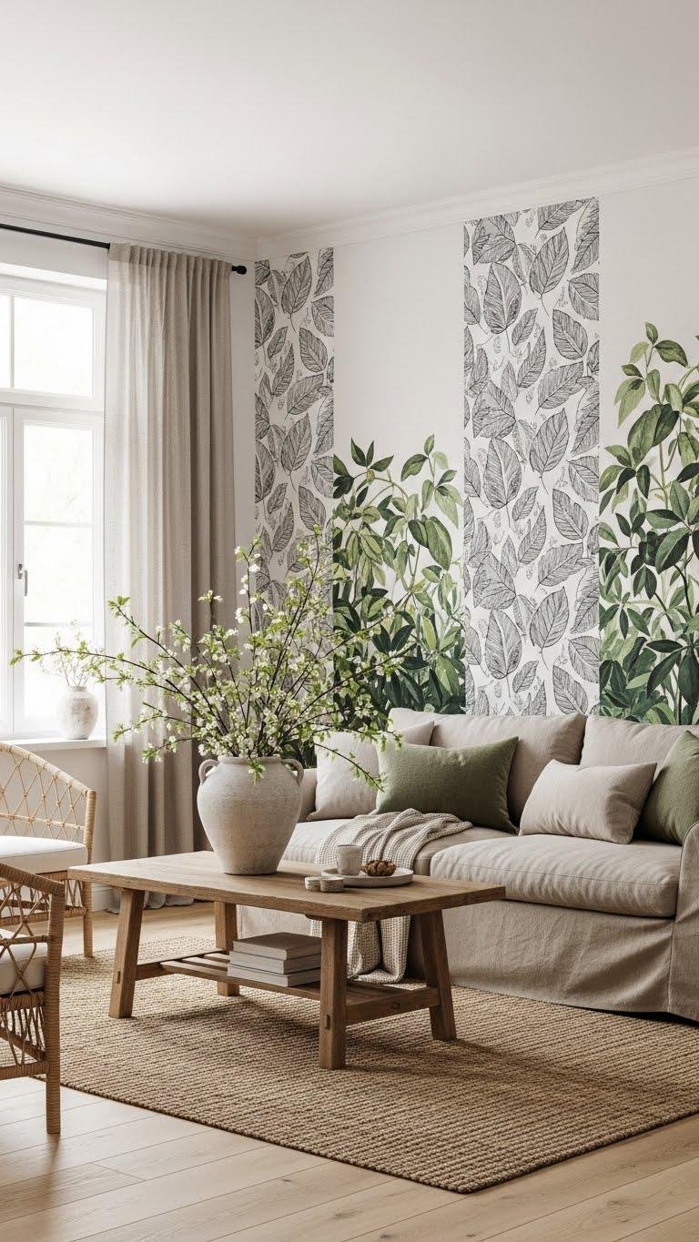 Statement wallpaper with botanical prints can instantly anchor a neutral spring room, bringing lush pattern and organic movement without overwhelming the calm palette.