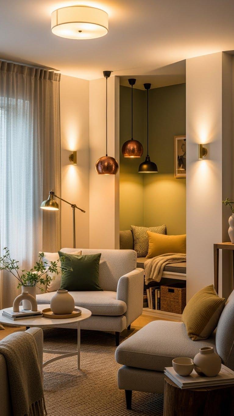Often a room’s mood hinges on its lighting, and layered fixtures in warm metallics give neutral spring spaces a soft, modern glow. You’ll mix ambient sconces with hammered pendants and a dimmable overhead to sculpt daylight and evening vibes. Choose brushed brass or soft copper finishes for warmth, keep lines simple, and let light create airy, liberated moments throughout your home.