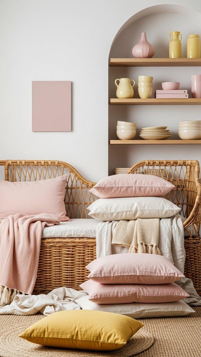 After grounding the room with natural woven textures, introduce soft blush pink and buttercream yellow to lift the mood without stealing the calm. You’ll layer vintage blush pillows and throws with buttery linens, add buttercream ceramics on open shelves, and pick a single art piece in muted pink. These accents feel modern yet lived-in, giving you breezy freedom without overpowering the neutral base.