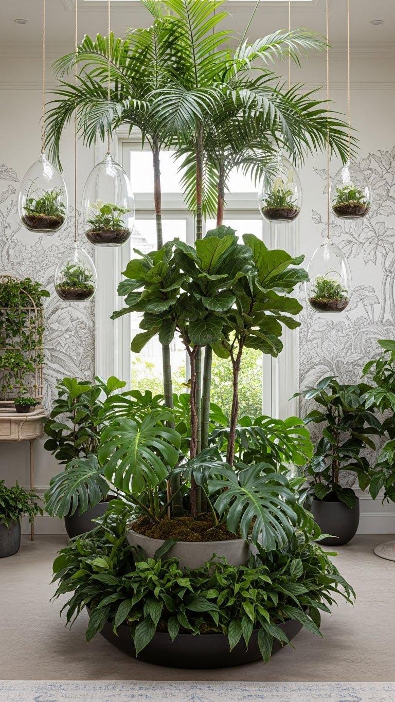 When you bring in an oversized planter, it anchors the room and instantly raises the energy with lush, sculptural foliage; think broad-leafed figs, dramatic monsteras, or tall palms that draw the eye upward without cluttering the neutral calm.