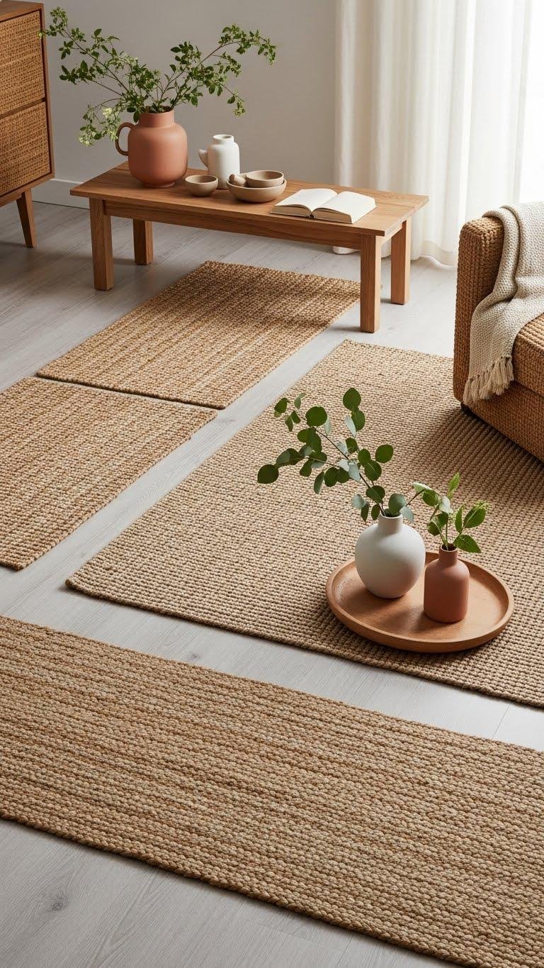 Layer smaller jute runners for movement, anchor seating with a sisal blend, and keep color restrained so freedom feels built-in and effortless.