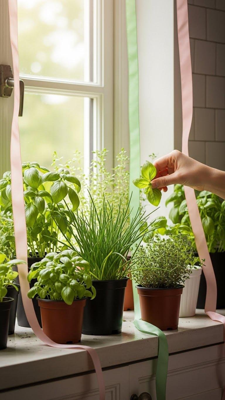After you’ve softened entryways with pastel ribbons, carry that calm into the kitchen by lining your windowsill with a living herb garden. You’ll practice micro herbology, grouping compact pots for scent and flavor. Do sunlight mapping to place basil, chives, thyme where they’ll thrive. It’s a practical, serene ritual that frees your routine—pluck fresh herbs, breathe deeper, live lighter.