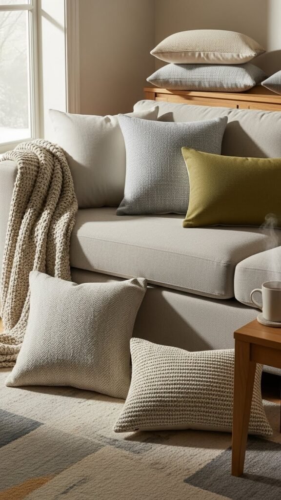Choose neutral machine washable throws in natural fibers for effortless warmth, and pick removable cushion covers so you can refresh looks or wash spills without fuss. Opt for textured weaves and muted tones to stay stylish, practical, and free from seasonal fuss.