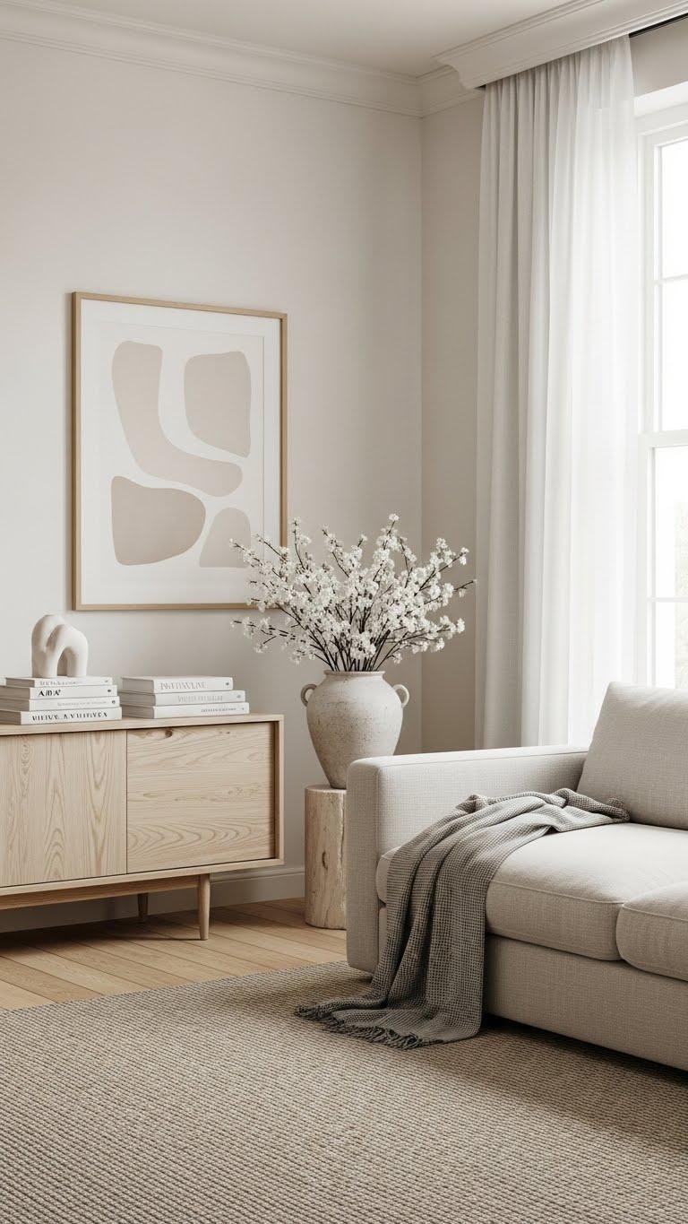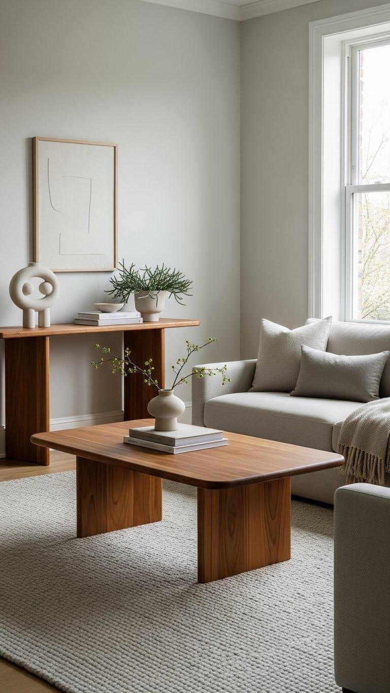 A warm-wood anchor piece—think a mid-toned coffee table or sculptural console—grounds your neutral palette and adds natural depth without breaking the calm. Choose pieces with low sheen finishes and rounded edges to keep forms soft and approachable.