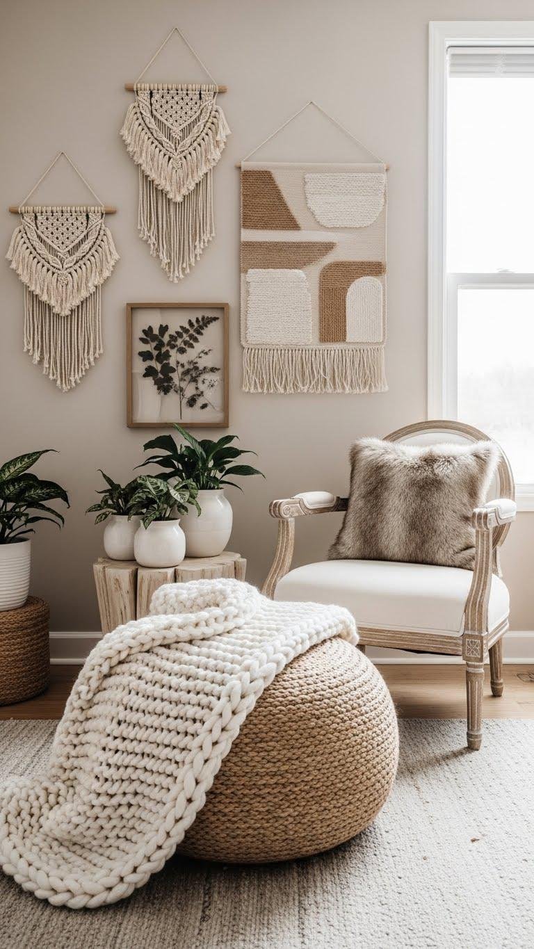 Once you’ve set a soft neutral base, layering chunky knits and faux fur brings tactile warmth without changing the calm color story. You’ll toss a knit throw over an oversized poufs corner, add a faux fur pillow, and hang textured wallhangings to anchor texture. These touches invite lounging, feel luxe without fuss, and keep the room airy yet cocooning for free-spirited living.