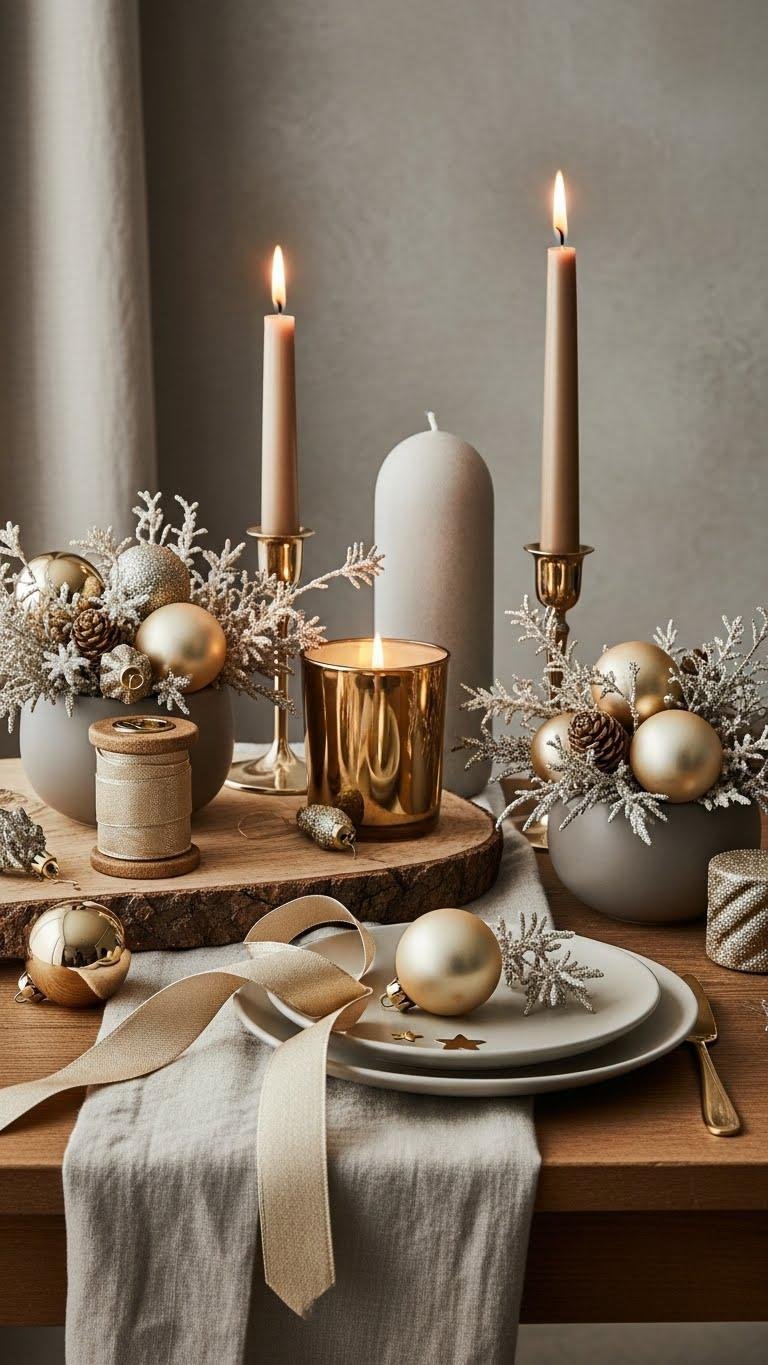 Blending soft metallics into your neutral holiday palette adds just the right amount of sparkle without shouting, letting warmth and restraint coexist. You’ll balance soft brass ornaments, champagne accents on ribbon and candles, and matte neutrals to keep things elegant. Mix textures—linen, wood, satin—to stay modern yet relaxed. Keep arrangements minimal so each metallic detail breathes and feels intentionally free.