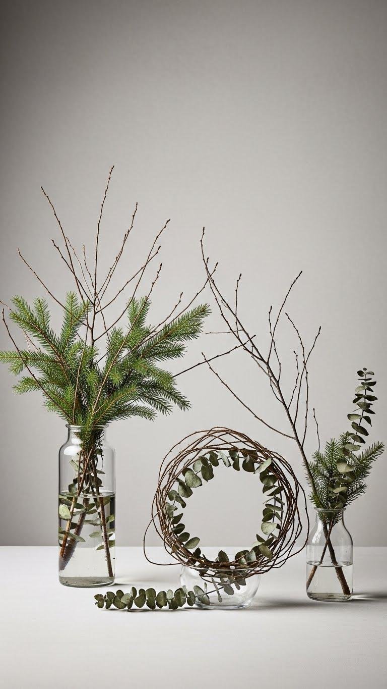 Evergreen clippings and bare-branch arrangements bring natural structure and quiet scent to a neutral winter palette, so you can introduce seasonal life without overpowering a restrained scheme. You’ll layer sprigs of dried eucalyptus with slender bare branches in simple vases or hang twig mobiles for vertical interest. Keep tones muted, shapes sculptural, and placements sparse so your space feels open, calm, and liberated.