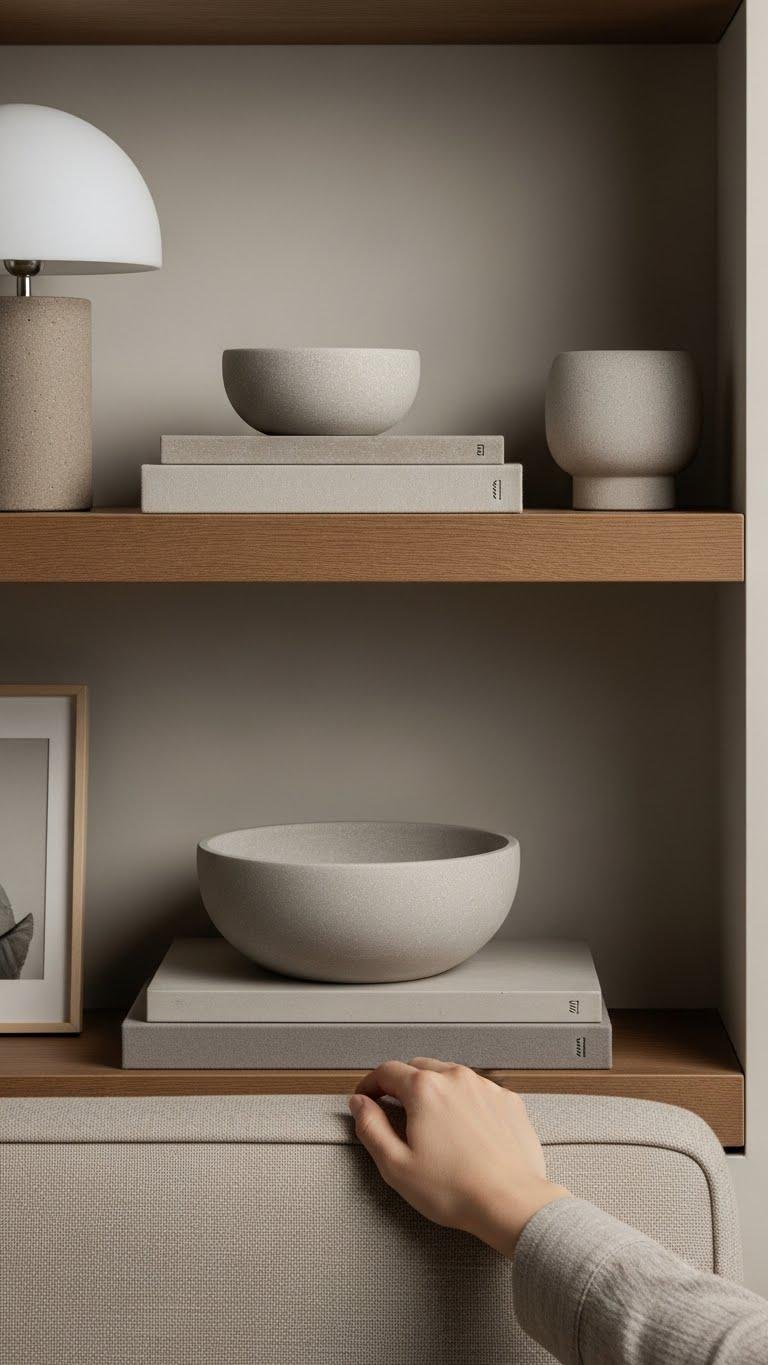 You’ll choose pieces like a satin pebble bowl or ashcrete vignette tray to punctuate shelves and mantels. They whisper restraint, invite touch, and let your space breathe with effortless, liberated calm.