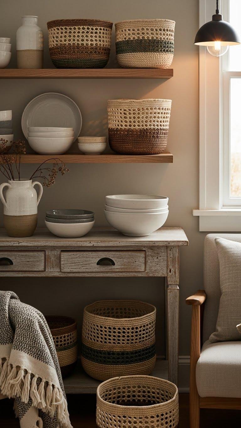 You’ll mix pieces with subtle artisan glazing and open-weave textures, pairing raw clay bowls with baskets dyed via natural dyeing for restrained color. Layer them casually on shelves and consoles to create a liberated, lived-in feel that’s quietly modern.