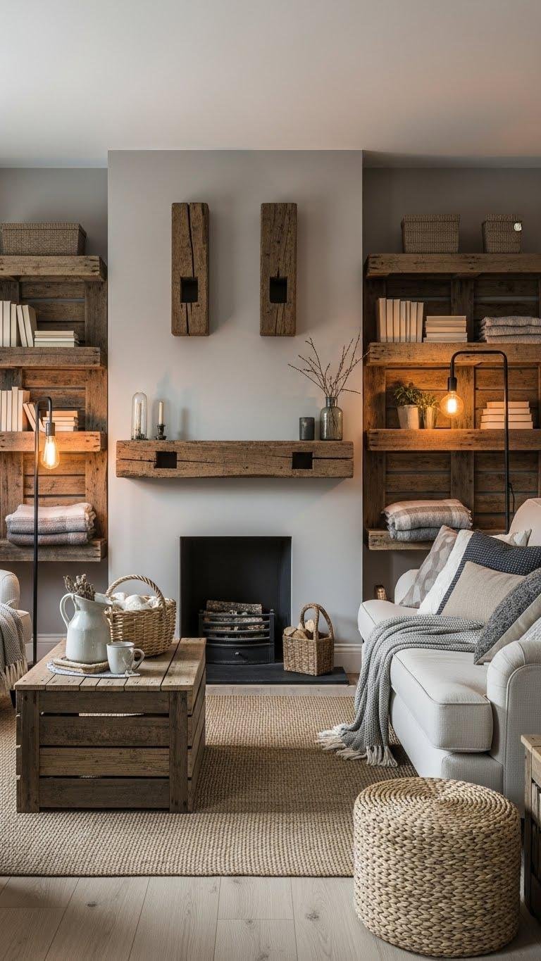 When you bring reclaimed wood into a neutral winter scheme, it anchors the room with aged character and eco-conscious intent without stealing the spotlight.