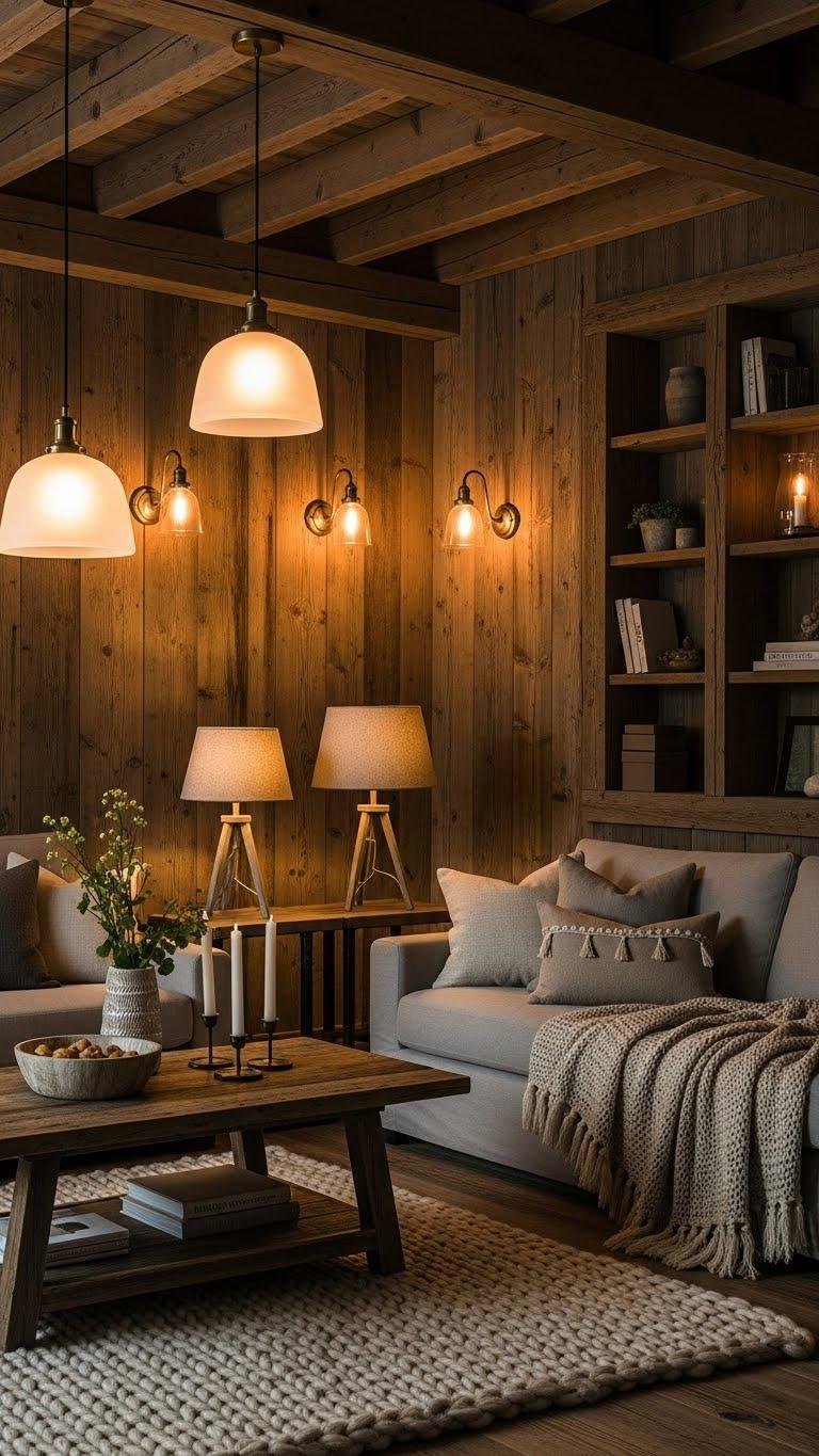 Pairing reclaimed wood with a dimmable warm lighting scheme keeps the room feeling intimate and intentionally curated.