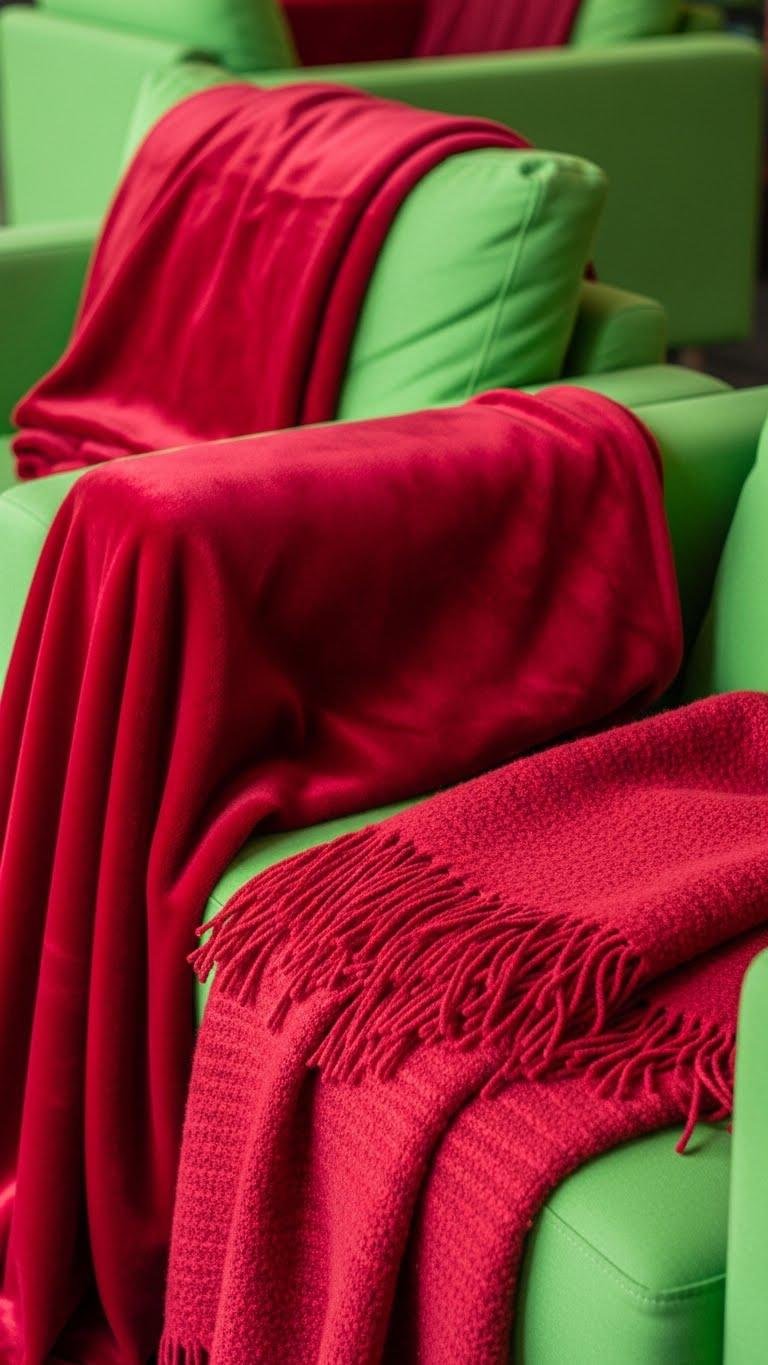 Layer Velvety Red Throws Over Bright Green Seating