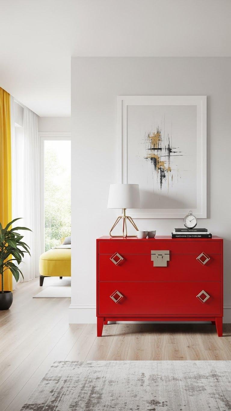 Bring in a red chest to anchor your bedroom and watch the whole scheme sharpen—its saturated hue and clean silhouette make it an instant focal point that reads modern and deliberate. Choose a vintage lacquer finish and bold geometric hardware to fuse retro glamour with minimal lines.