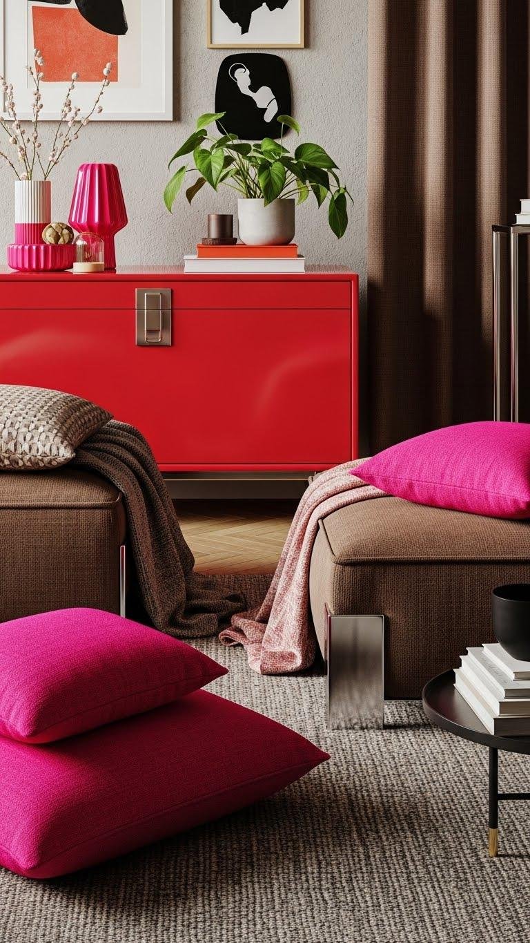 Let the red chest’s confident color set the stage, then soften the scheme by pairing playful bright pink accents with dusty brown textiles—this mix keeps things modern while adding warmth and tactility. You’ll balance textile contrast by choosing matte, nubby fabrics against slick metallics, favoring muted brightness in cushions and throws. Trust texture to free the palette without overwhelming the room.