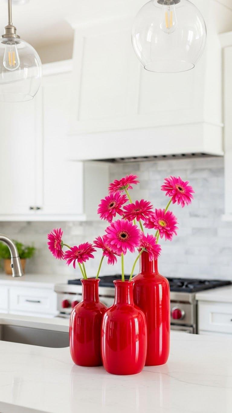 Brighten up your kitchen in an instant by arranging pink blooms in glossy red vases—the contrast reads modern and intentional, not fussy. You’ll create a striking Floral Centerpiece that balances Vase Contrast with effortless ease.