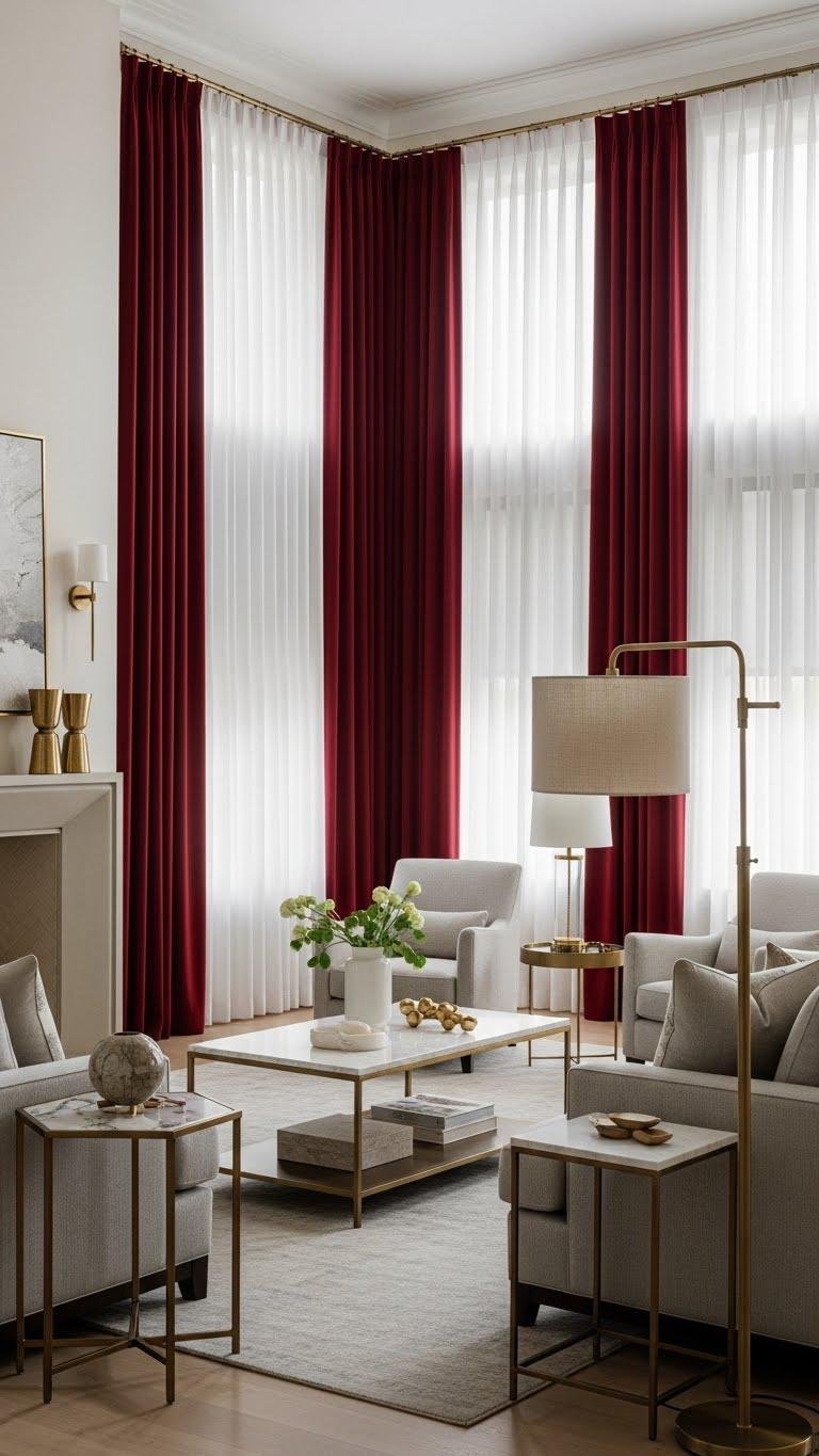 Anchor a neutral living room with deep red curtains to create instant warmth and visual drama while keeping the space sophisticated. You’ll choose floor to ceiling panels for scale, mix layered sheers for light control and softness, and add blackout liners for privacy and contrast. Position hardware high, break the palette with brass accents, and let bold drapery define your liberated, modern retreat.