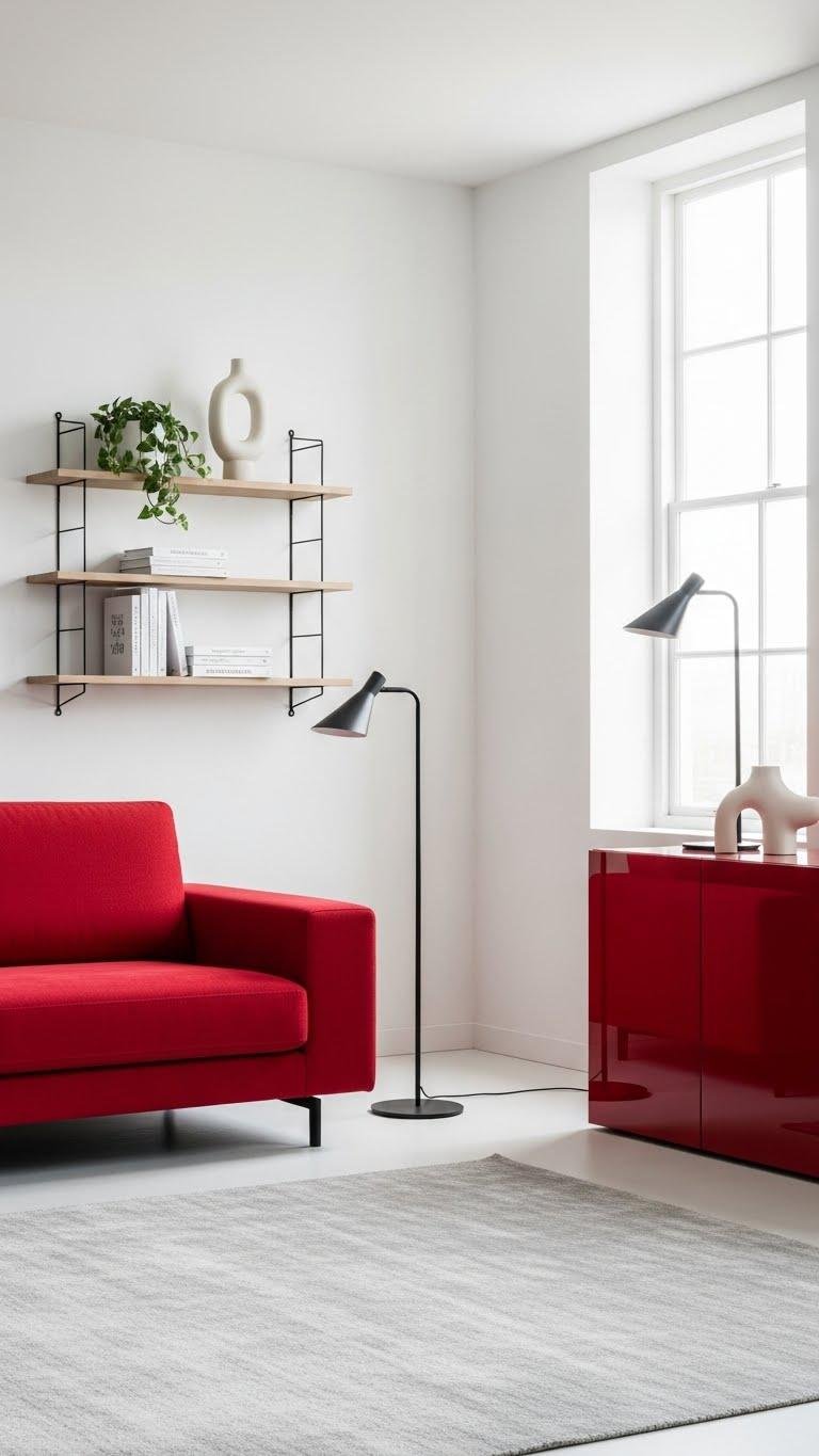 Balancing a statement red sofa or lacquered credenza with ample white and gray keeps the room feeling modern and intentional rather than overwhelming. You’ll anchor bold pieces with contrast neutrals—matte white walls, soft gray rugs—then add minimalist accents like slim metal lamps and streamlined shelving.