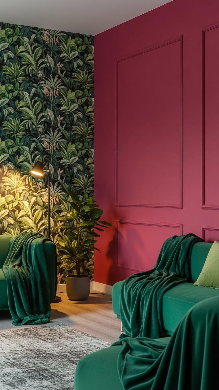 After you’ve played with velvety throws to punctuate green seating, elevate the room further by installing a crimson accent wall framed with tropical green wallpaper on the adjacent plane. You’ll create a confident crimson focal wall that balances warmth and vibrancy. Choose matte paint, crisp trim, and oversized botanical patterns for bold tropical contrast, then arrange minimal decor so the palette breathes and feels liberating.