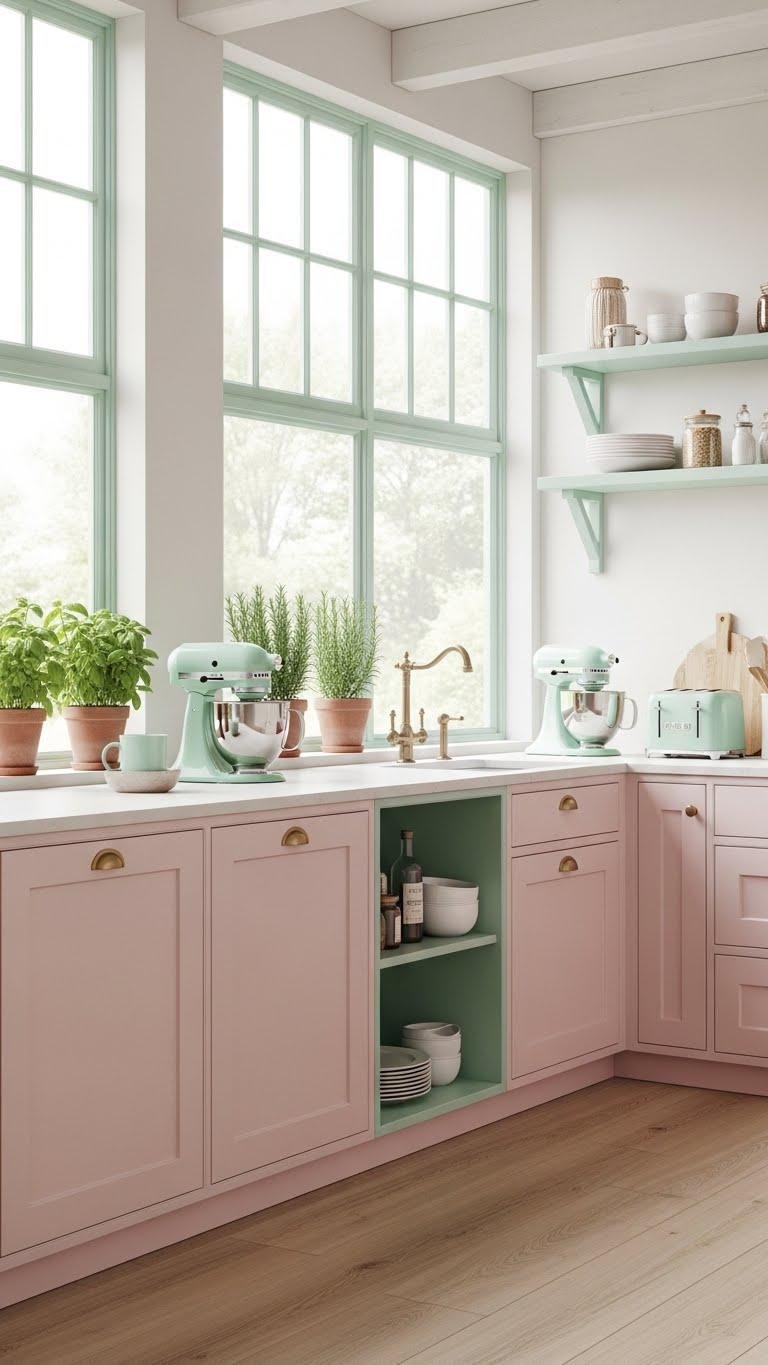 Pair Pastel Pink Cabinets With Mint Green Accents