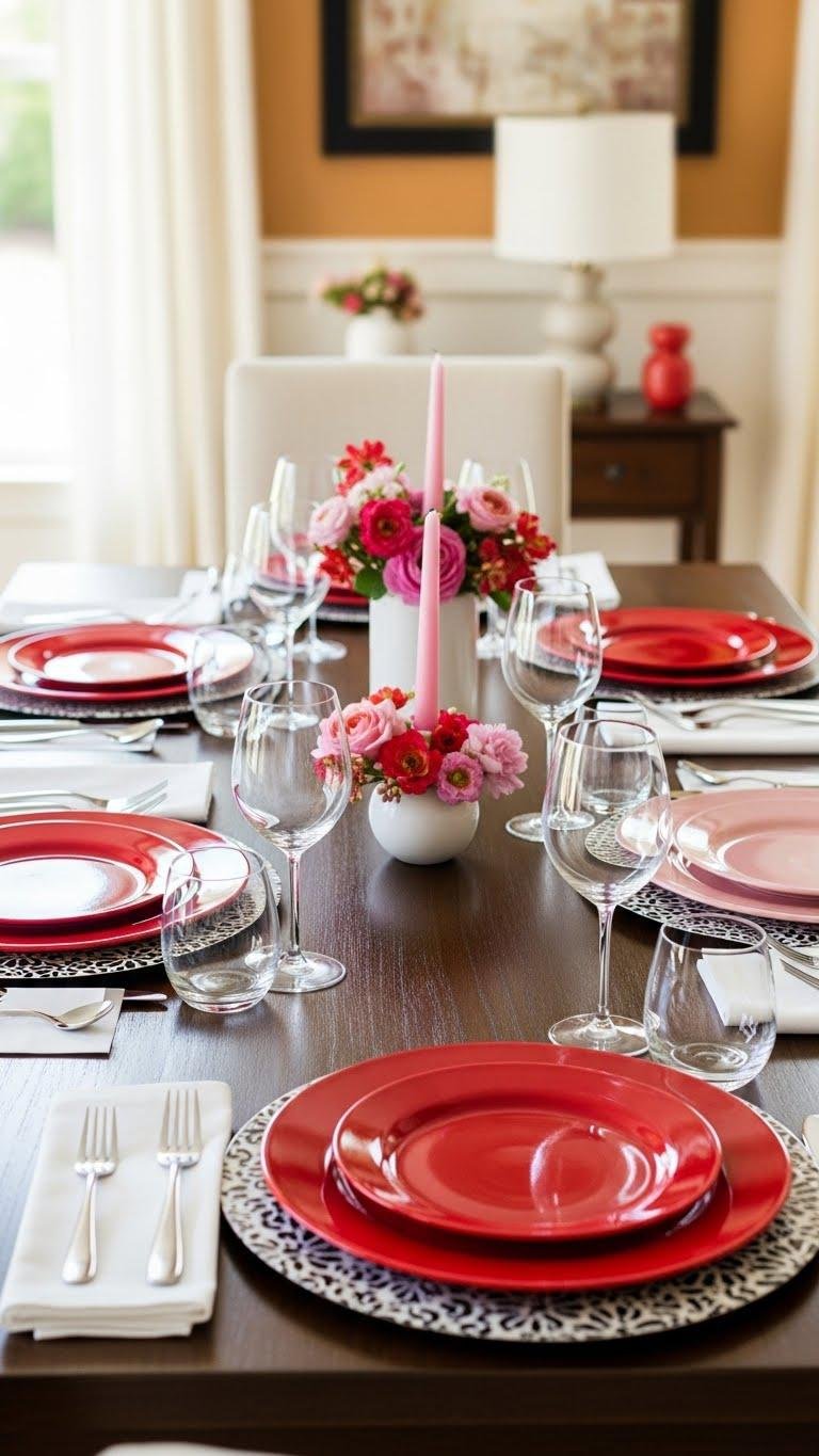 Shifting from living-room warmth to the table, you can carry that russet-and-beige sensibility into dining with a spirited mix of red and pink dinnerware. Choose bold plates, alternating hues for vibrant place settings, and mix matte ceramics with glossy accents.