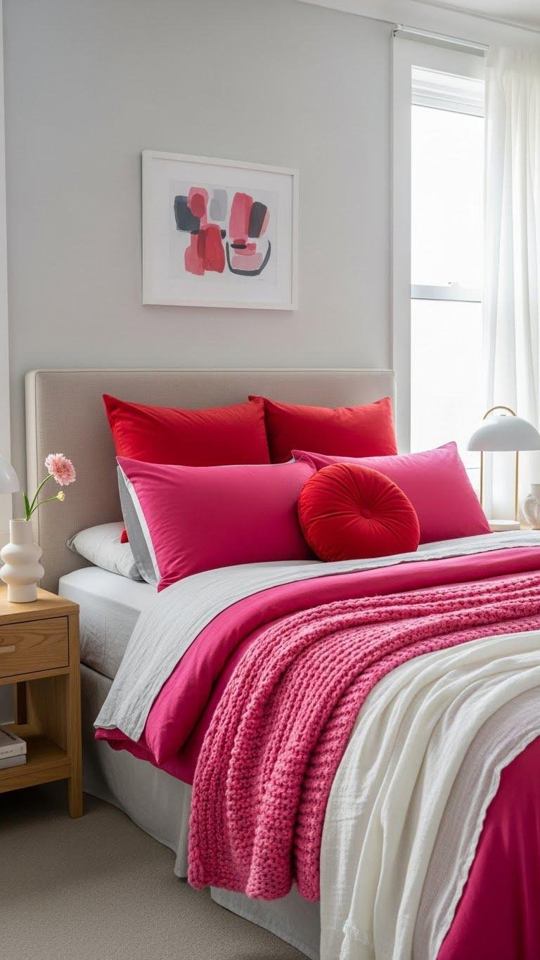 Layer hot pink bedding with scarlet pillows and neutral sheets to create a bold, fashion-forward bedroom that feels curated rather than chaotic. You’ll embrace scarlet contrast while keeping calm with neutral sheets, balancing intensity and ease.