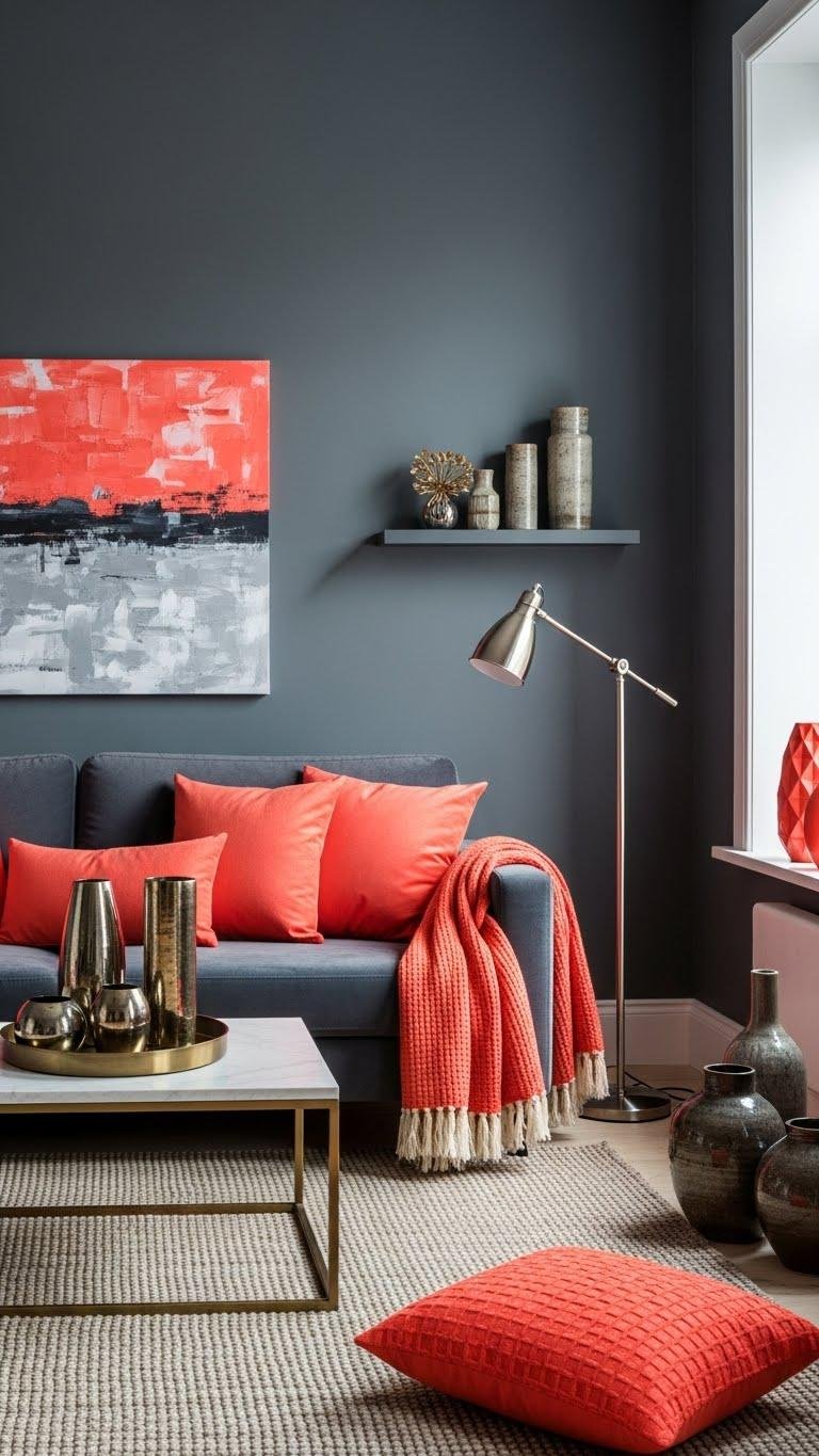 Style a Living Room With Charcoal Gray and Coral Accents