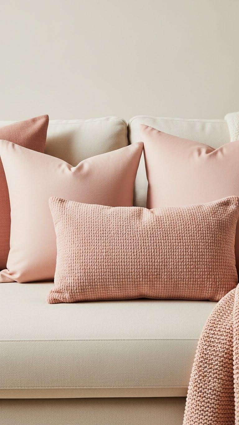 A few well-chosen blush pink cushions can instantly warm a cream sofa and elevate the room’s palette without overpowering it; pick mixes of matte linen, subtle sheen silk, and a textured knit to create visual depth.
