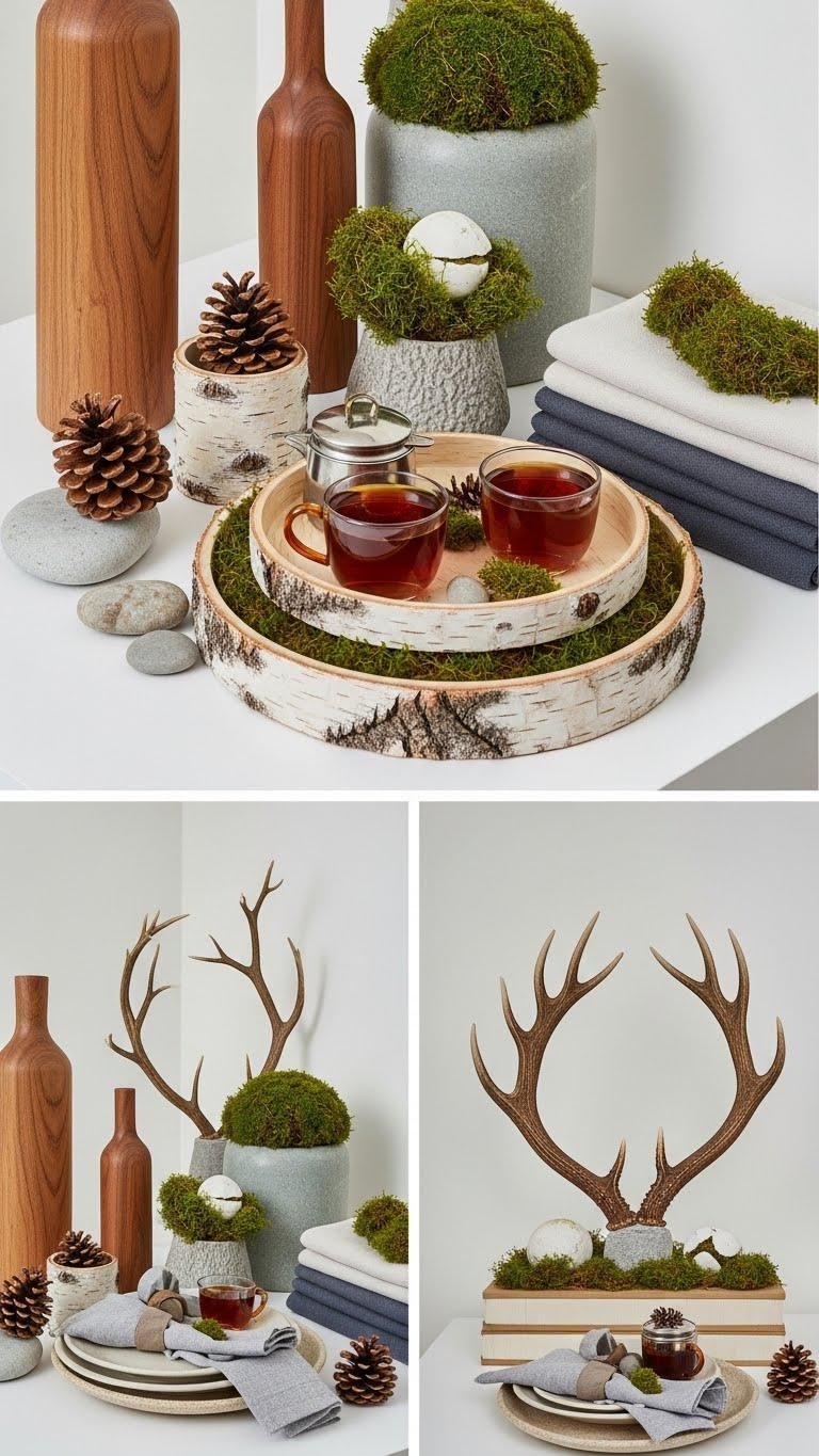 If you want to bring the quiet richness of the forest indoors, layer warm woods, soft mossy greens, and natural stone to create a Woodland Elegance display that feels both refined and lived-in. You’ll pair a birch tea display in a sculptural tray with an antler silhouette vignette, tactile linens, and a handful of pinecones for an effortless, freeing shelf composition.
