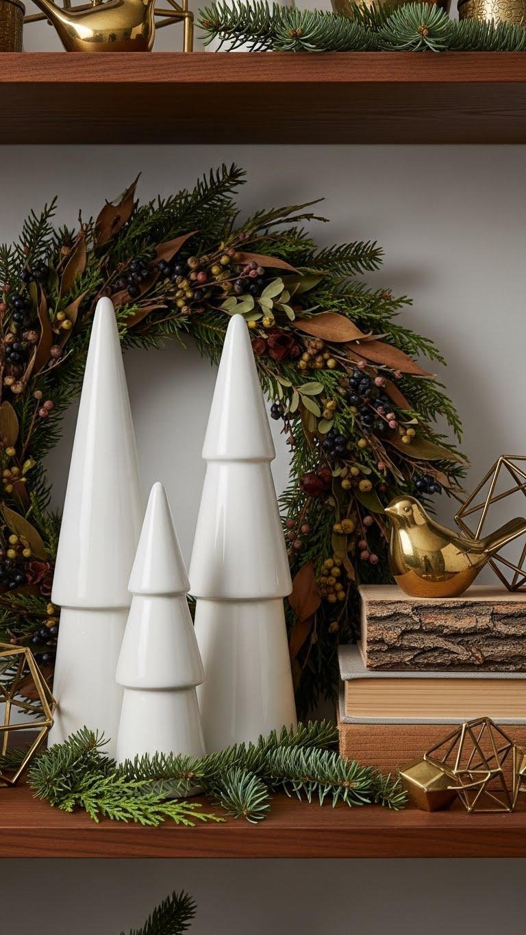 Set a trio of white ceramic trees on your shelf to introduce a quiet, sculptural focal point that balances the organic wreath backdrop. You’ll place a porcelain trio with varied heights for rhythm, letting matte glaze catch low light. Pair them with a sparse evergreen accompaniment and raw wood books or brass accents so the vignette feels curated, tactile, and freely composed.