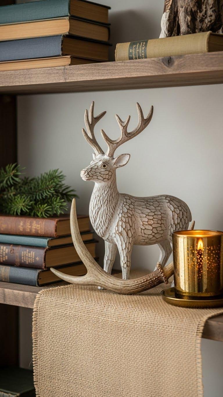 A hand-carved reindeer brings rustic charm to your shelf, its weathered finish and simple lines anchoring a vignette that feels lived-in and intentional. You pair a handcrafted antler accent with a soft burlap runner, stacking weathered books and a brass candle for warmth.